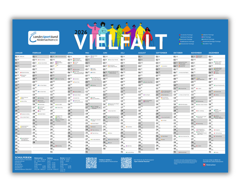 Auch für das Jahr 2026 gibt es wieder den LSB-Vielfaltskalender! Neben den Schulferien sind wichtige Feiertage verschiedener Religionsgemeinschaften sowie besondere Thementage im Bereich „Teilhabe und Vielfalt“ markiert, z.B. der Internationale Tag gegen Rassismus oder der Internationale Tag der Menschenrechte. Verfügbar ist er in den Formaten A1 und in A3.